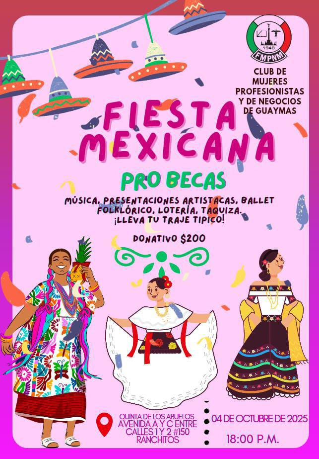 El Club Guaymas, presidido por Celida Botello Navarro, organizó una alegre y colorida Noche Mexicana con el propósito de recaudar fondos destinados a becas para estudiantes. El evento combinó tradición, música y solidaridad, reafirmando el compromiso del club con la educación y el impulso a las nuevas generaciones.